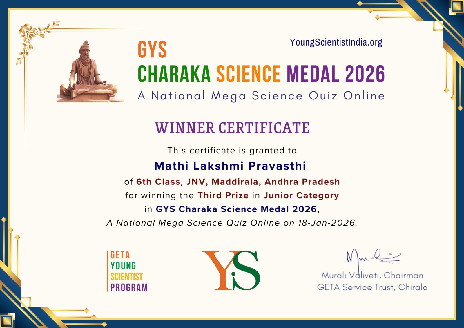 | Project Name | : | GYS Charaka Science Medal 2026 Winners Announcement |