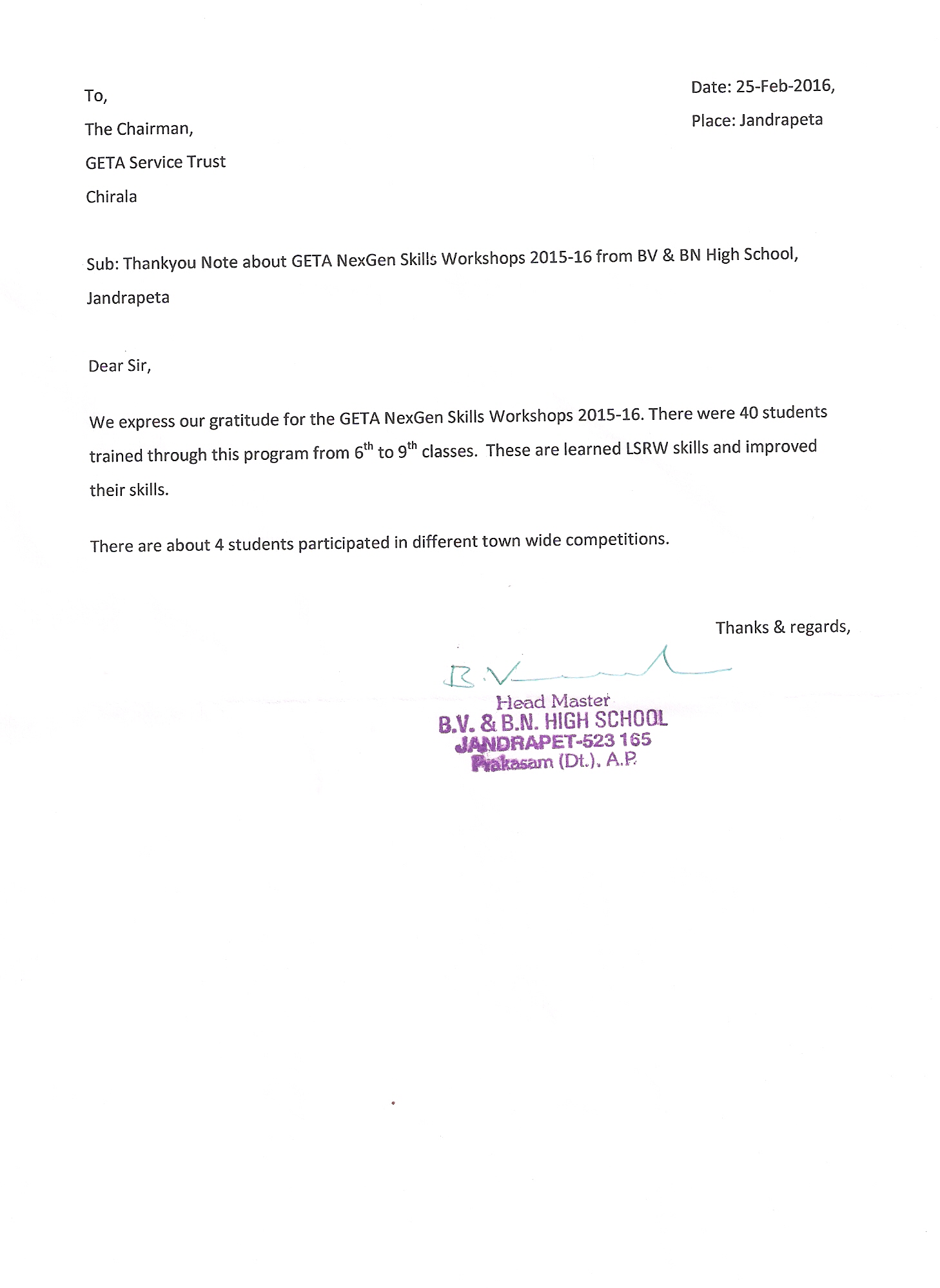 | Workshop Venue | : | BV & BN High School, Jandrapeta |