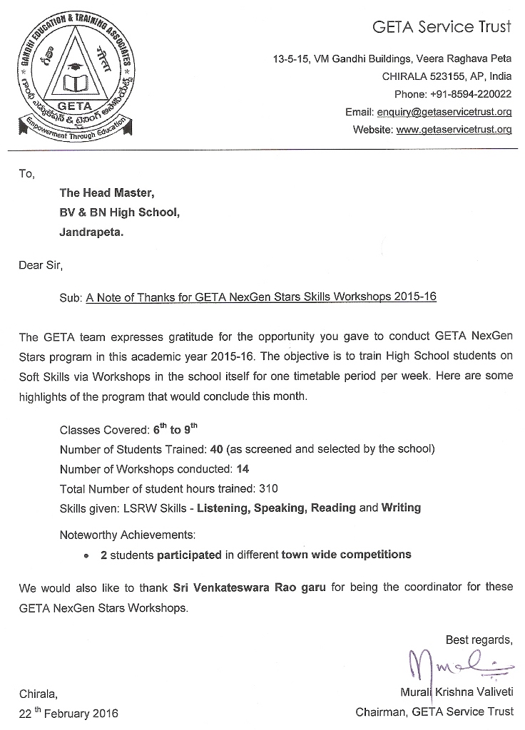 GETA NexGen Program 2015 - 16 CONCLUSION in BV & BN High School |