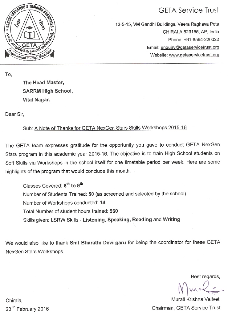 GETA NexGen Program 2015 - 16 CONCLUSION in SARRM High School |